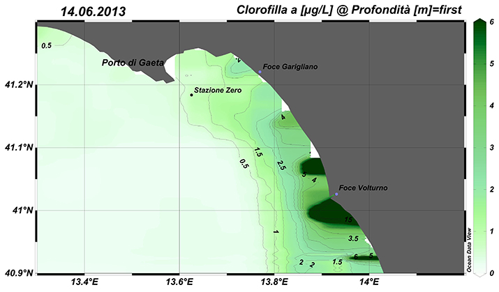 Immagine satellitare relativa alla distribuzione superficiale della concentrazione di clorofilla a e del solido sospeso nel Golfo di Gaeta.